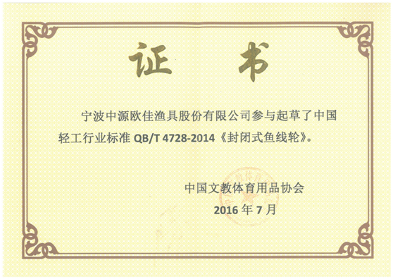 寧波中源歐佳漁具股份有限公司作為中國(guó)文教體育用品協(xié)會(huì)的會(huì)長(zhǎng)單位,積極參與起草了中國(guó)輕工業(yè)標(biāo)準(zhǔn)QB/T 4728-2014《封閉式魚(yú)線輪》和中國(guó)輕工業(yè)標(biāo)準(zhǔn)QB/T 1475-2014《旋壓式魚(yú)線輪》,并受到了協(xié)會(huì)的表彰。