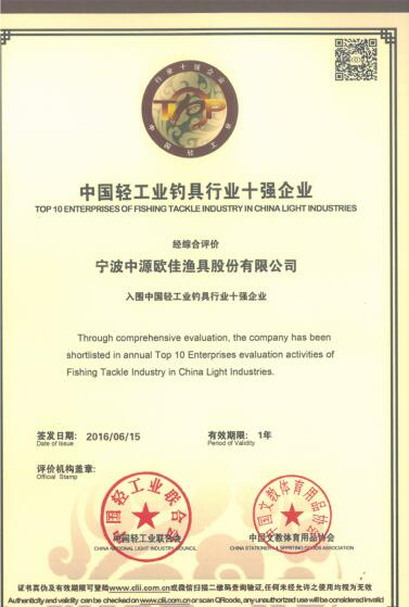 為促進輕工企業(yè)提高競爭力,鼓勵輕工先進企業(yè)做大做強,本著嚴(yán)謹(jǐn)、公正、科學(xué)的原則,中國輕工聯(lián)合會于2016年6月份開展了2015年度“中國輕工行業(yè)十強企業(yè)”的評選工作。經(jīng)過嚴(yán)格的評選,公司被評為2015年度“中國輕工業(yè)釣具行業(yè)十強企業(yè)”,并于近日收到了由“中國輕工業(yè)聯(lián)合會”及“中國文教體育用品協(xié)會”聯(lián)合頒布的榮譽證書。